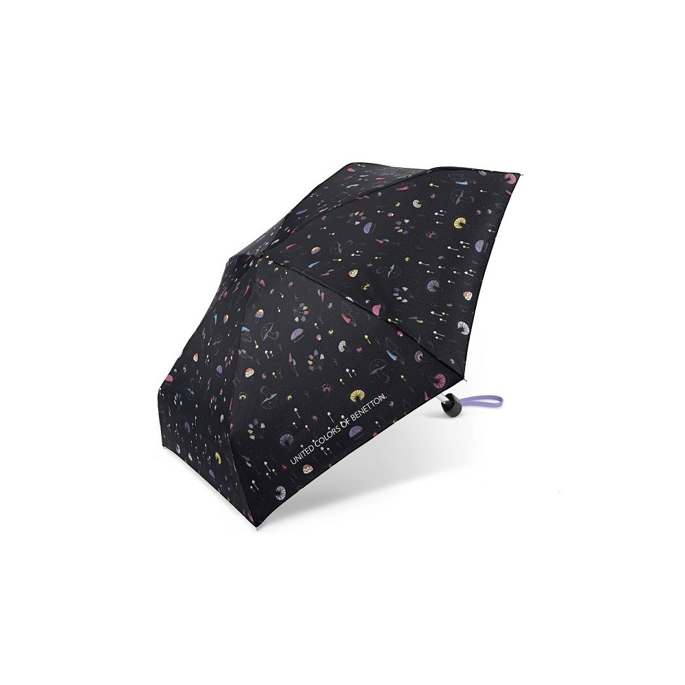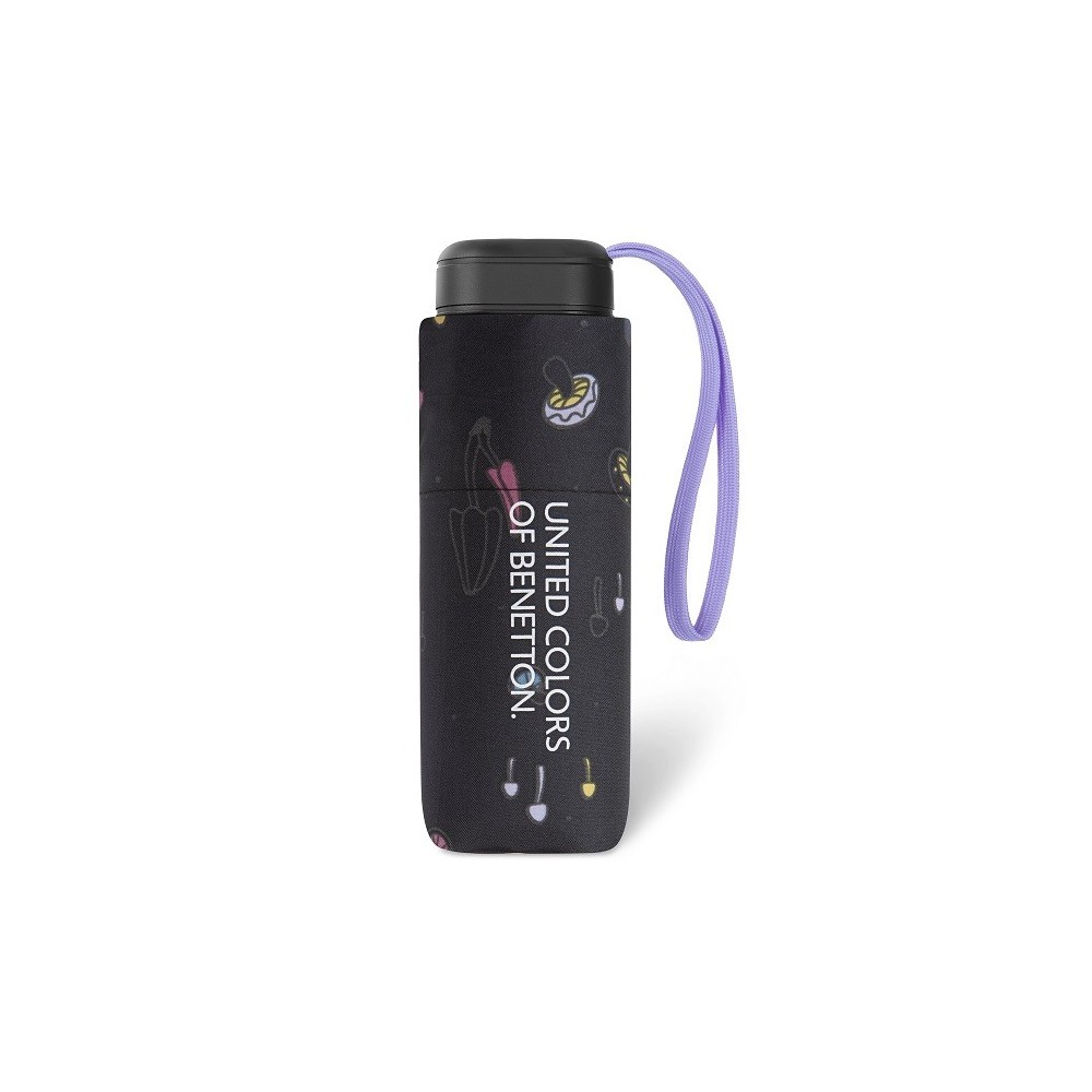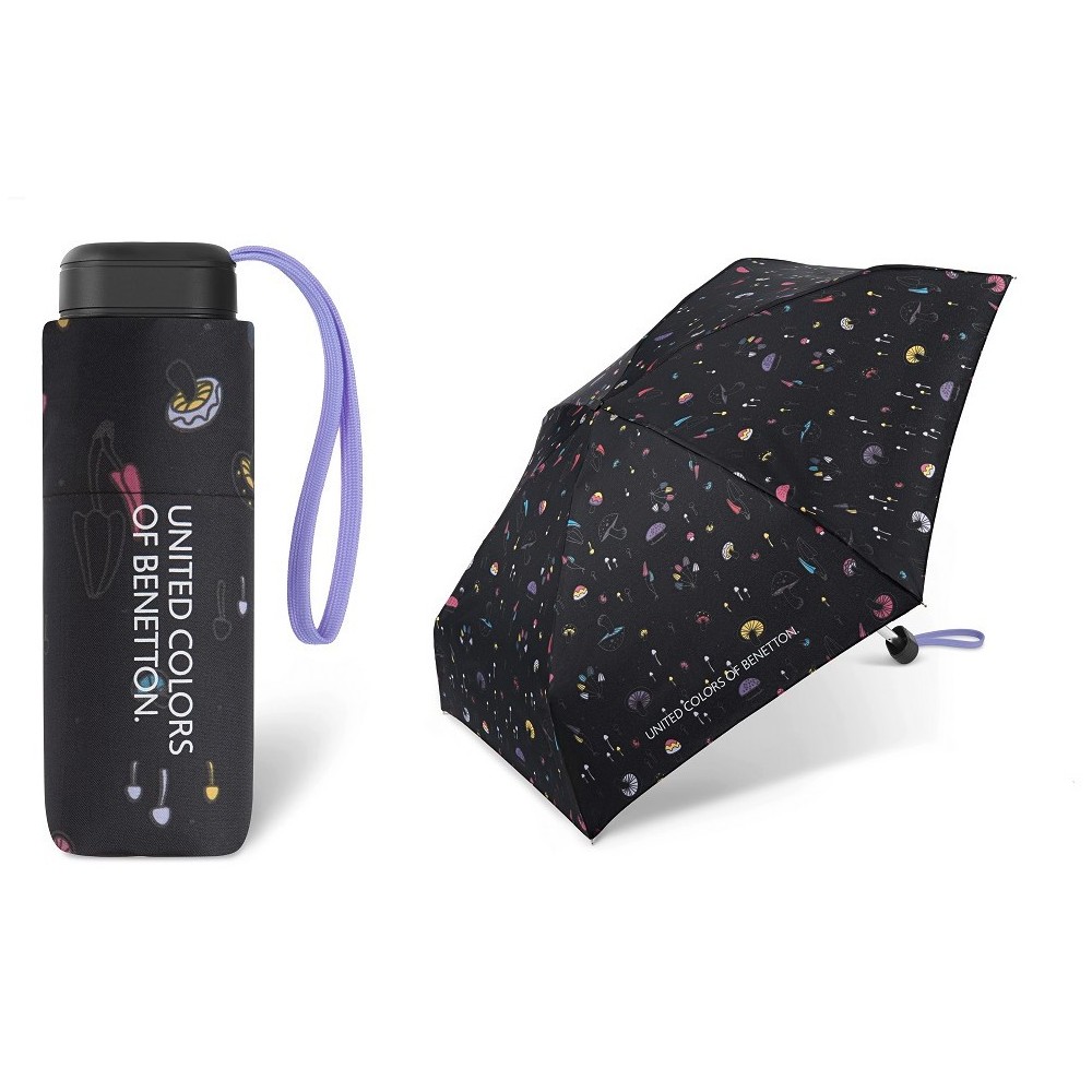 Deštník je černý s barevnými houbičkami a bílým nápisem Benetton.