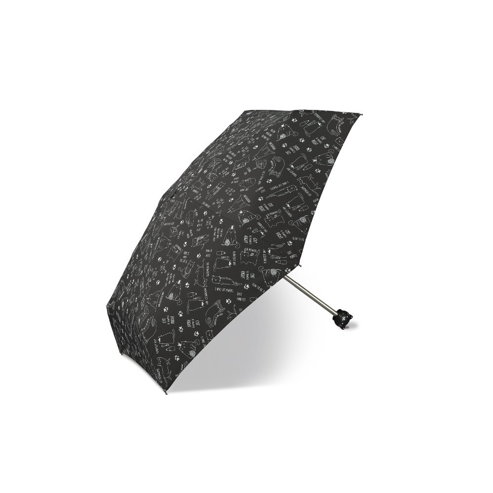 Maličkatý skládací deštník , černý s bílým potiskem a manuálním otevíraním.