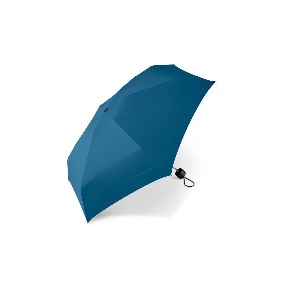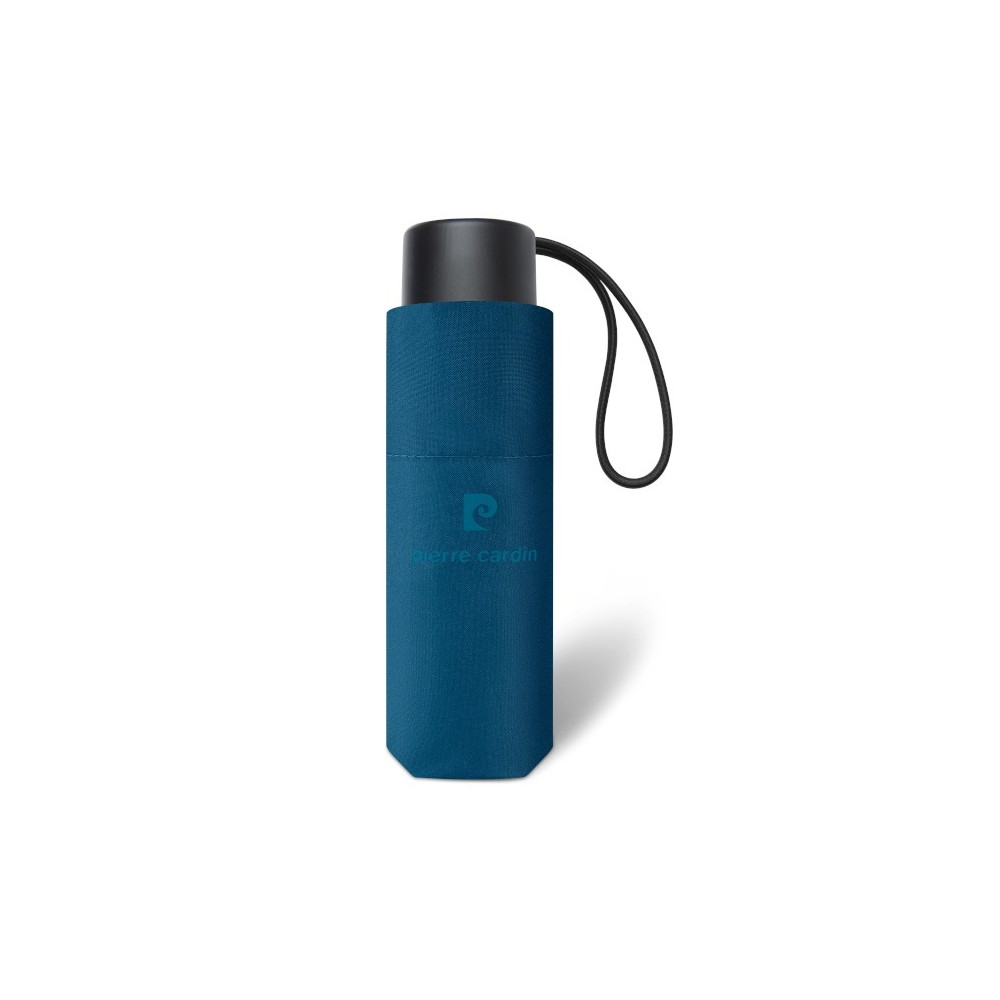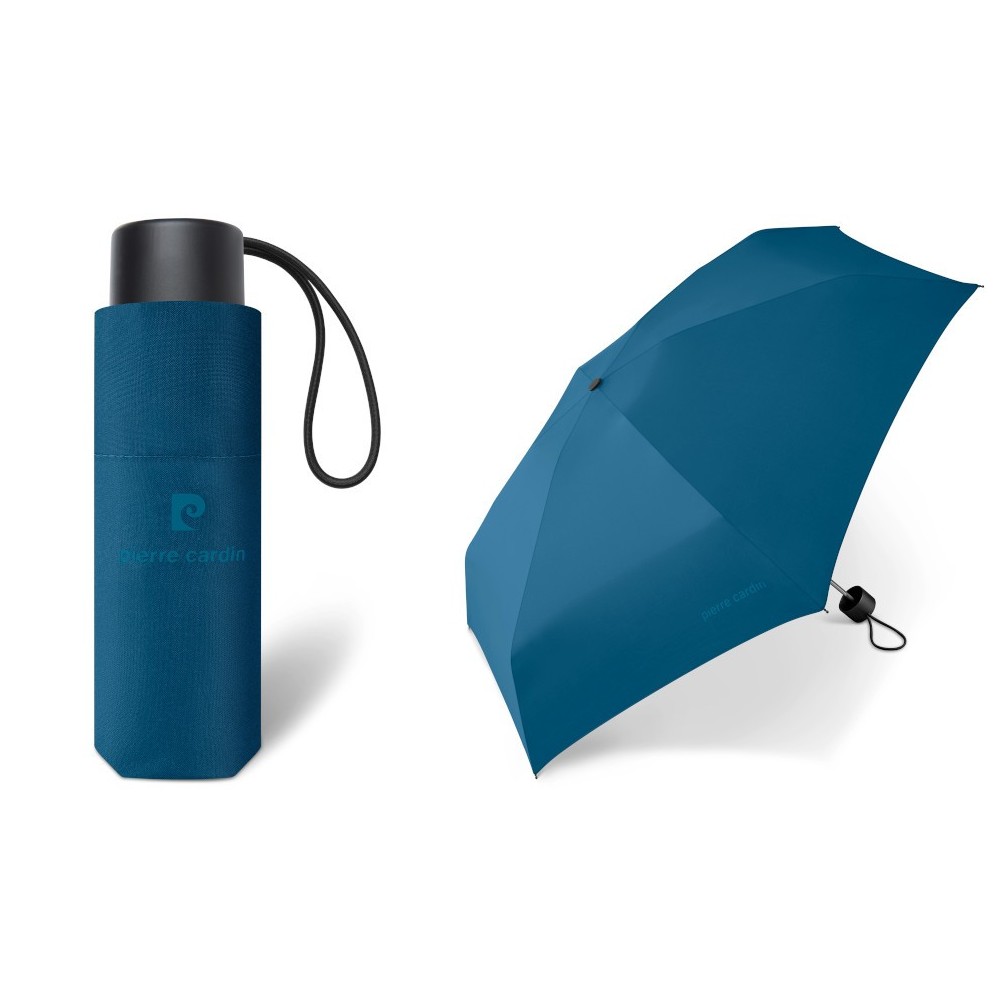 Barva deštníku je petrolejová a tyrkysové logo Pierre Cardin.