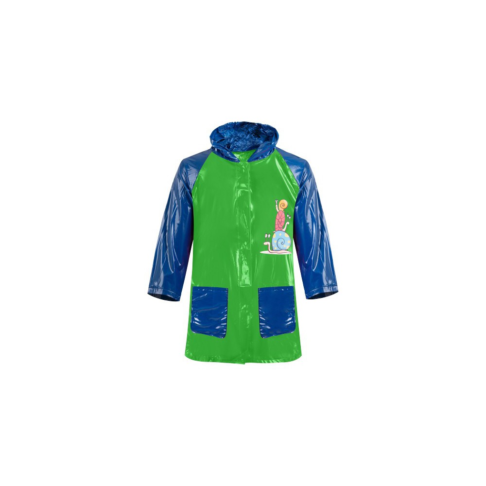 Dětská pláštěnka vyrobená z lesklého 100% PVC, dvoubarevná, s kapucou. Nová řada - s obrázkem tří šneků. Bez ftalátů.